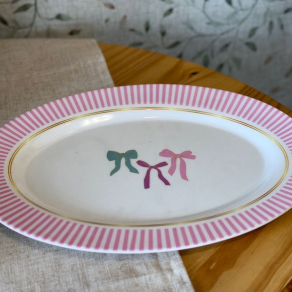 A bandeja oval em melamina de 35 cm é ideal para servir com praticidade e elegância, trazendo charme e delicadeza à mesa. Com design encantador, apresenta estampa decorativa de laços em tons suaves, harmonizada com detalhes listrados na borda, que valorizam a peça e deixam a composição ainda mais sofisticada.