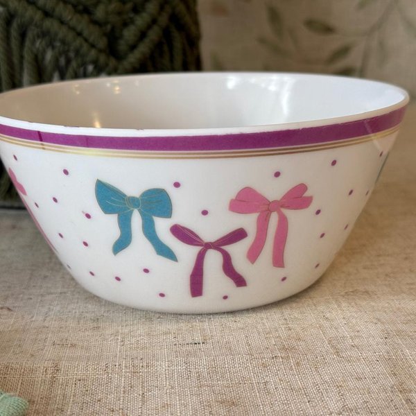 Encante sua mesa com este bowl delicado e cheio de charme. Com acabamento branco e detalhes em laços coloridos em tons suaves de rosa e azul, ele traz um ar romântico e alegre para qualquer ocasião. Os pequenos poás e a borda decorada complementam o design, tornando a peça perfeita para compor mesas postas especiais, café da manhã, sobremesas ou até mesmo para servir petiscos com elegância.