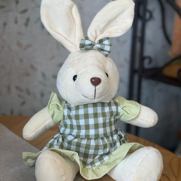 Delicada e encantadora, esta coelha de pelúcia é perfeita para trazer charme, aconchego e um toque lúdico à decoração. Confeccionada em pelúcia macia, ela veste um lindo vestido em tecido xadrez, com mangas delicadas e laço na orelha, que deixam a peça ainda mais especial.