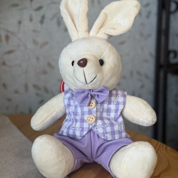 Encante sua decoração com este lindo coelhinho de pelúcia, perfeito para trazer charme e aconchego ao ambiente. Com toque macio e acabamento delicado, ele veste uma roupinha em tecido xadrez com gravatinha e botões decorativos, que dão um ar clássico e encantador à peça.