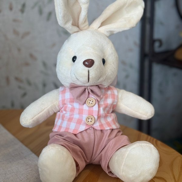 Encante sua decoração com este lindo coelhinho de pelúcia, perfeito para trazer charme e aconchego ao ambiente. Com toque macio e acabamento delicado, ele veste uma roupinha em tecido xadrez com gravatinha e botões decorativos, que dão um ar clássico e encantador à peça.