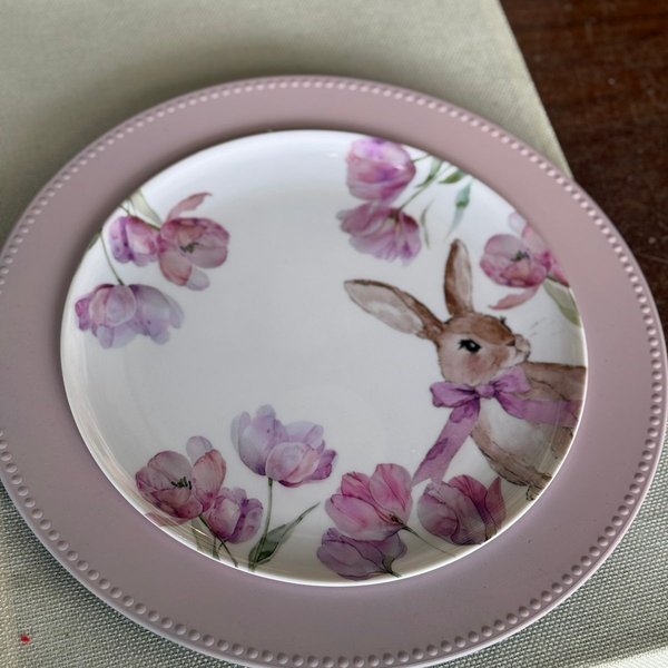 Encante sua mesa posta com este delicado prato de refeição em melamina, ideal para composições de Páscoa e ocasiões especiais. Com estampa suave de flores em tons rosados e um charmoso coelhinho, ele traz leveza, aconchego e um toque lúdico à decoração.