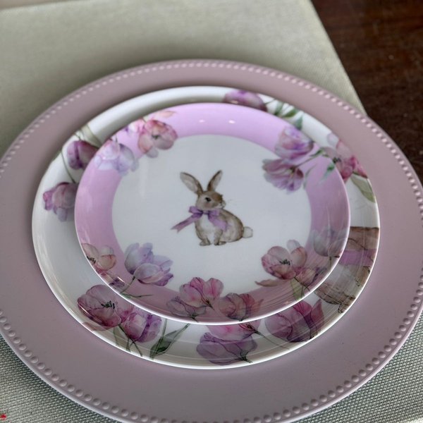 Encante sua mesa posta com este delicado prato de sobremesa em melamina, ideal para composições de Páscoa e ocasiões especiais. Com estampa suave de flores em tons rosados e um charmoso coelhinho central, ele traz leveza, aconchego e um toque lúdico à decoração.